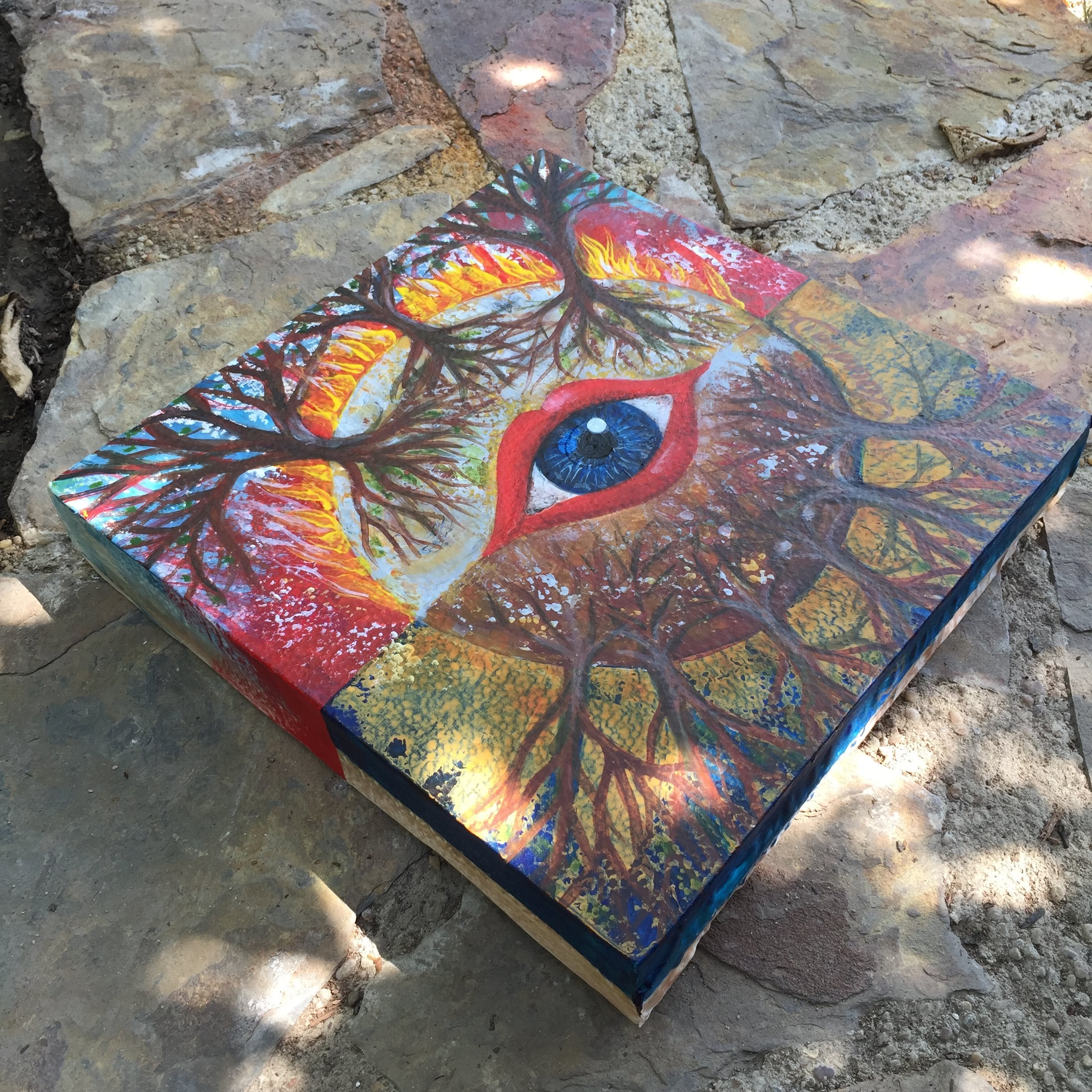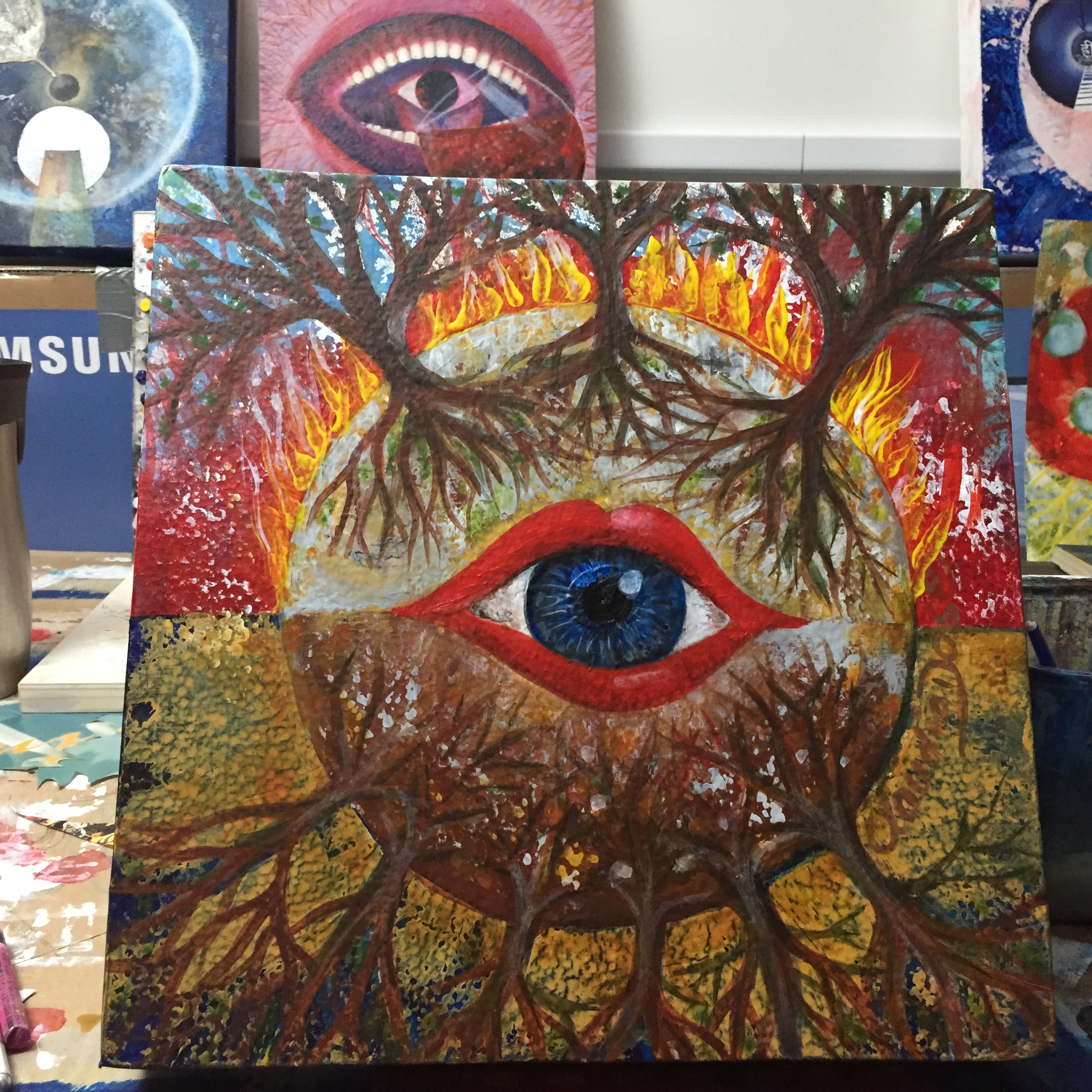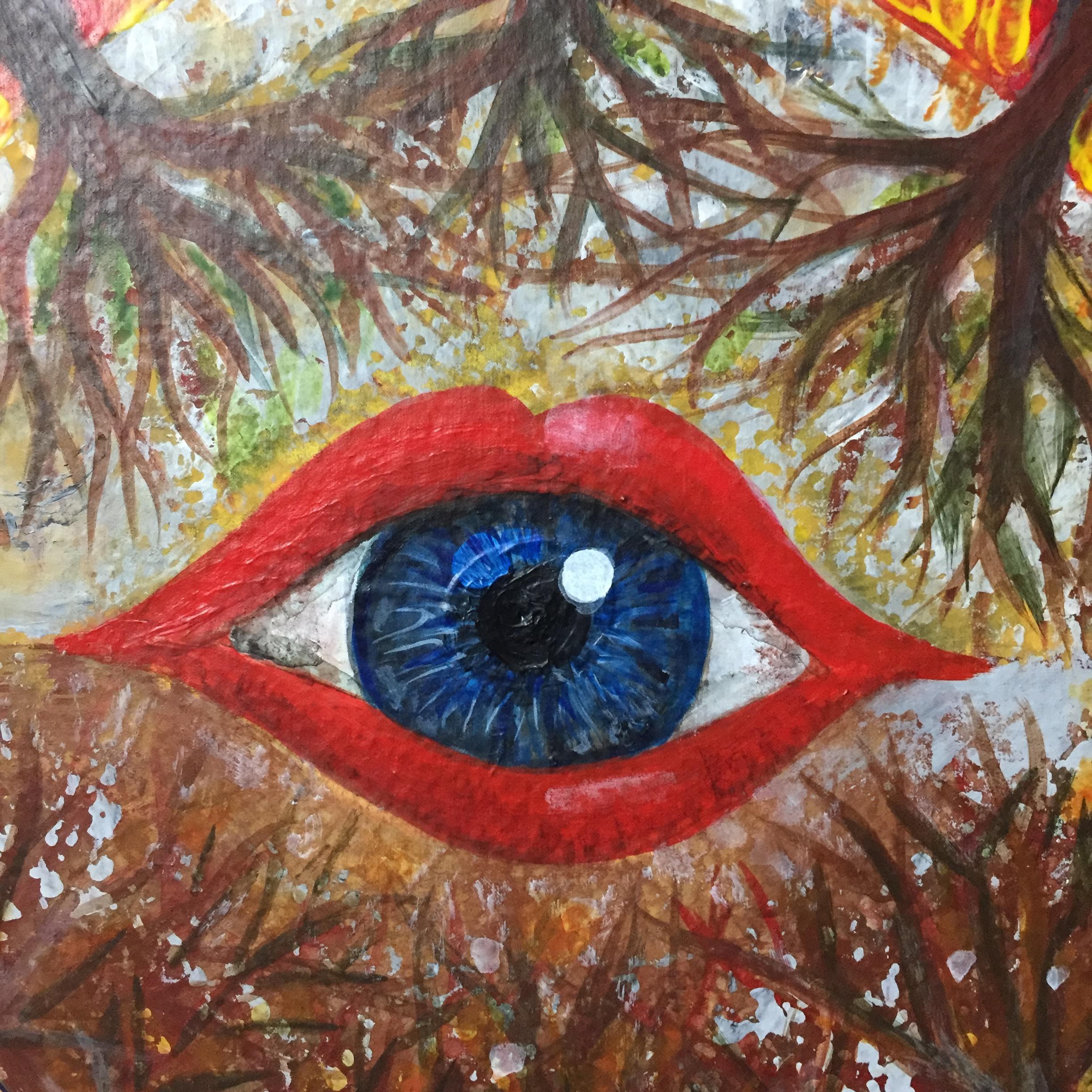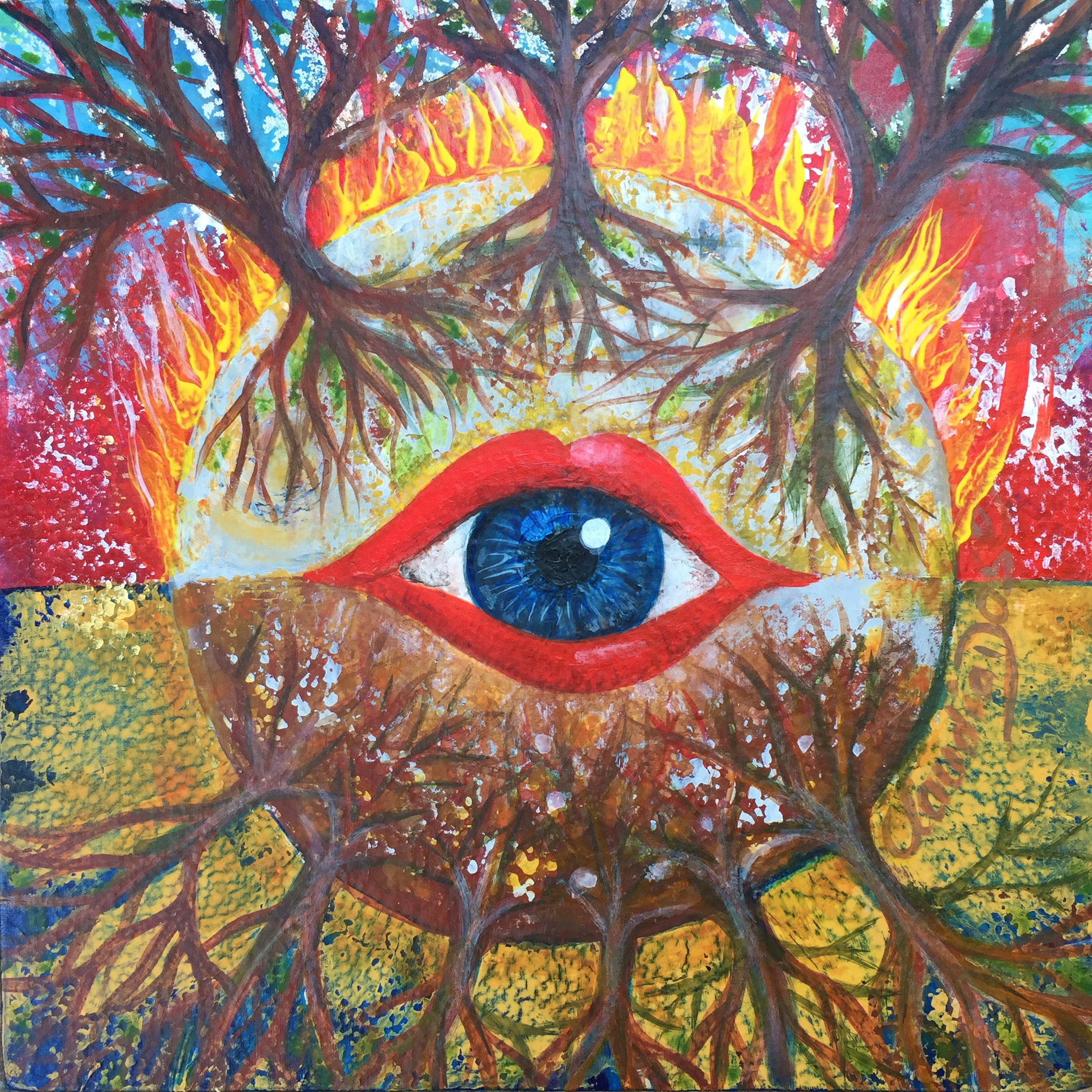 While I was painting images of destruction arose – with the summer and another wildfire season in California approaching – and I was reflecting on how, even after such violent fires, nature bounces back, even in some cases thrives. In fact, some trees can’t propagate and grow seeds without being exposed to the fire and extreme heat. And even without fires, all the time, the worms and bugs and microbes turn (“destroy”) vegetable leftovers into wonderful compost that allows for new growth. Even emotionally we often only grow after intense times of trauma or challenges.