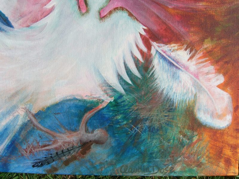 There is a real feather embedded in the painting but it’s not the white feather. Can you see it?