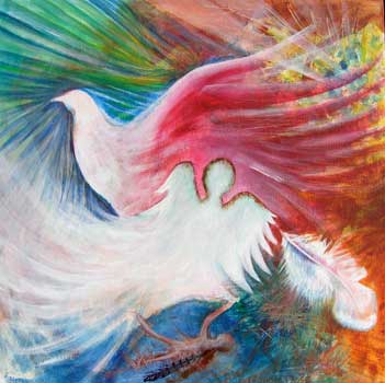 A mysterious dance between a (peace) dove and an angel (with burned wings). While a darker figure below is reaching out to the angel who has one of his feathers detached from it. Or is that the feather from the dove?