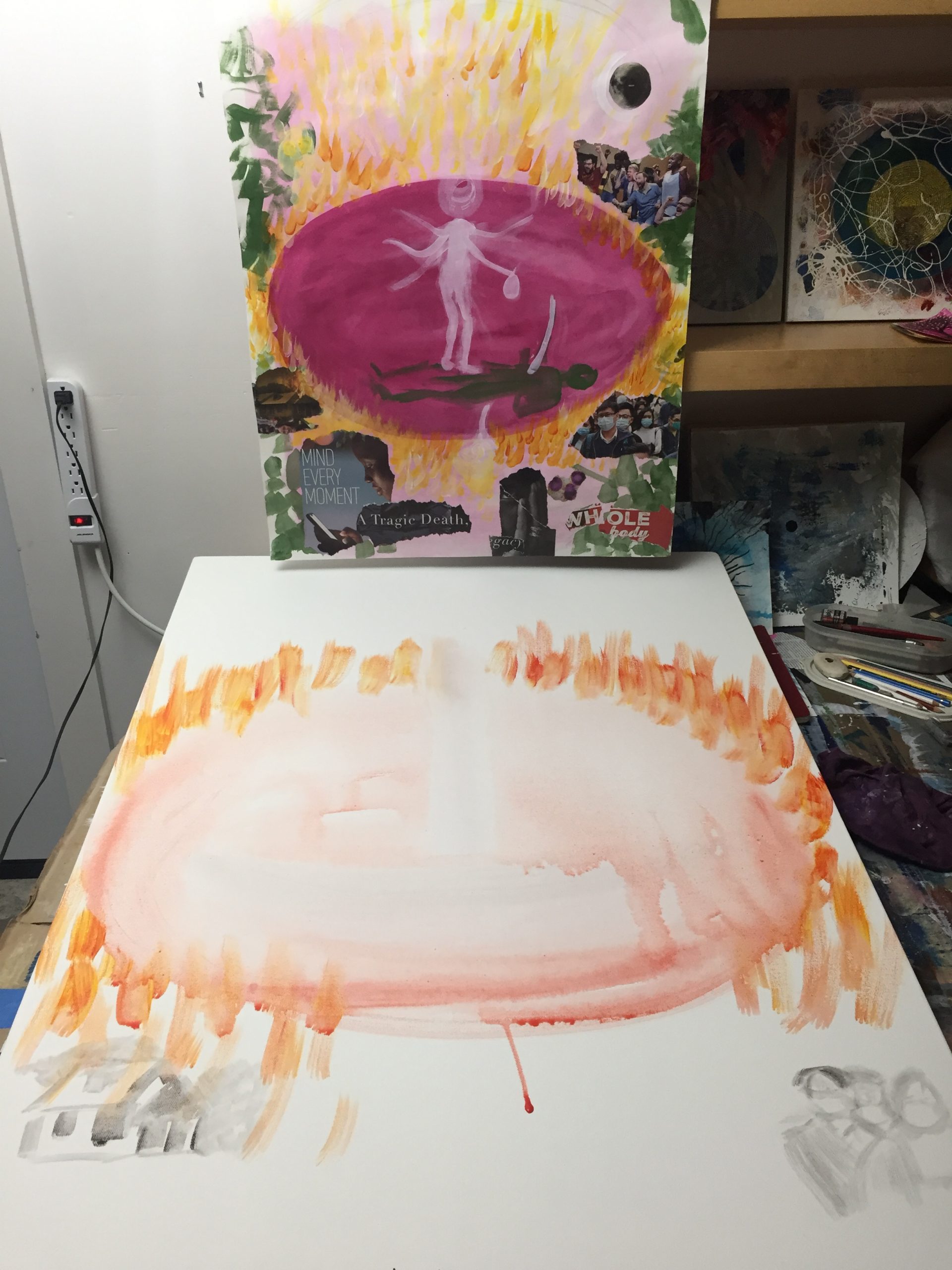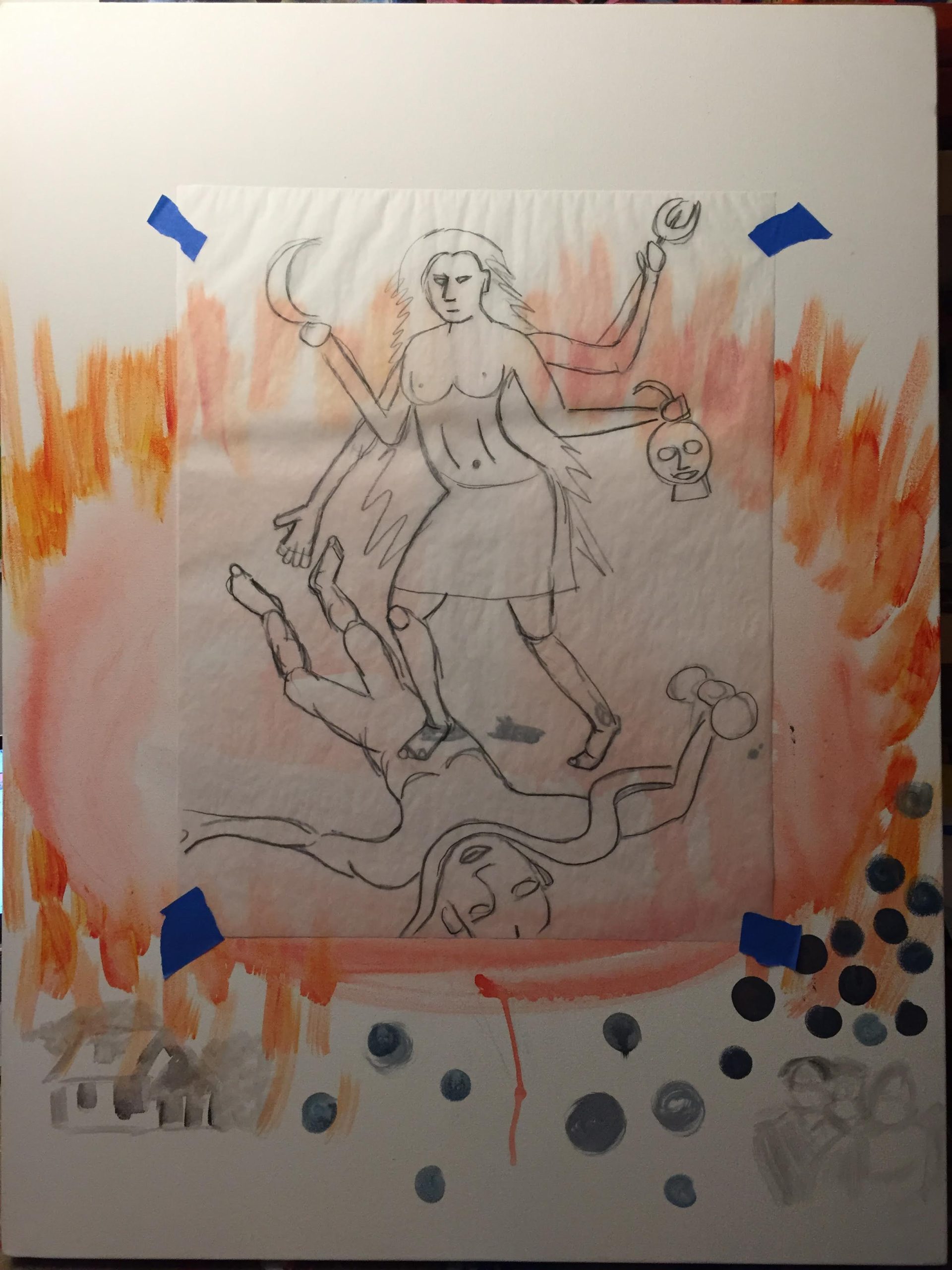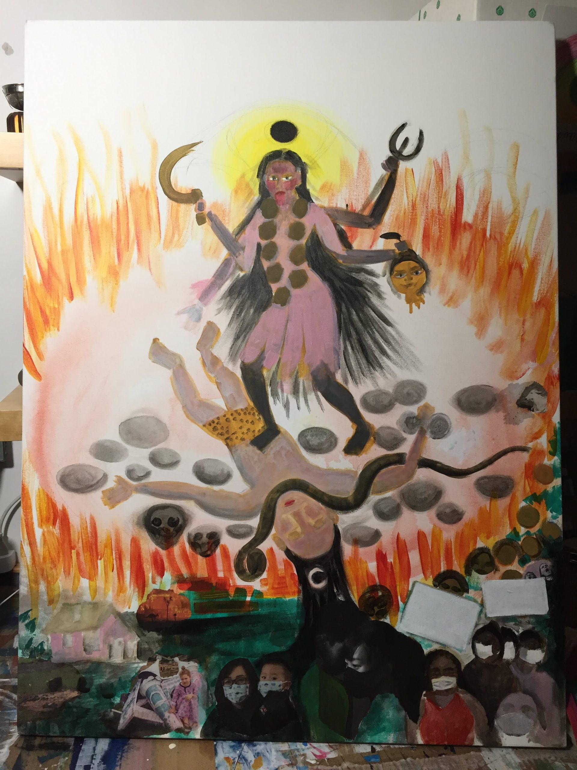 As an indirect result of my study of the 12 Kalis, and perhaps the current circumstances in the world at large, I found myself drawn towards painting Kali standing on Shiva with the surroundings slightly modernized to the current situations…
