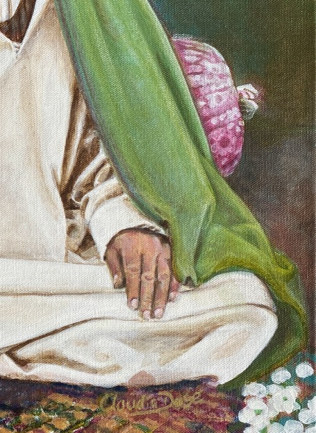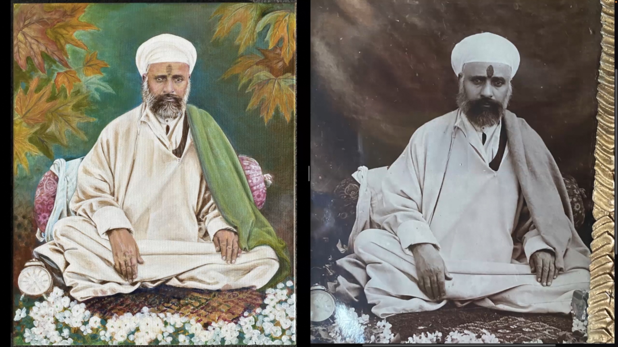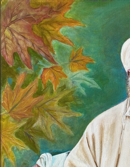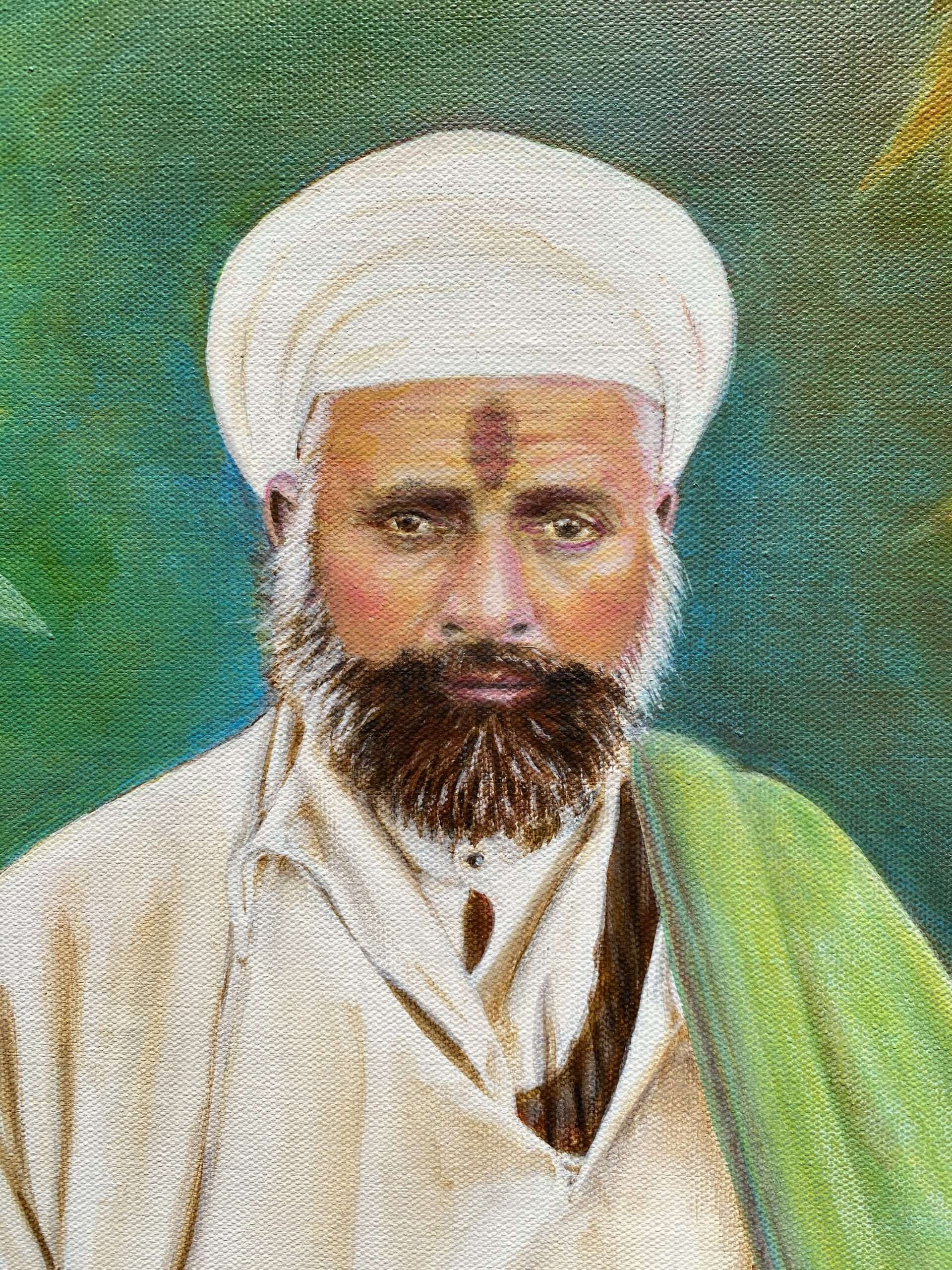 When I was in India in 2022, I saw a small captivating photo of my spiritual teacher’s teacher. His eyes looked straight at me, intense but compassionate, unlike any picture I had seen of him before. I had to paint a portrait of him in large.