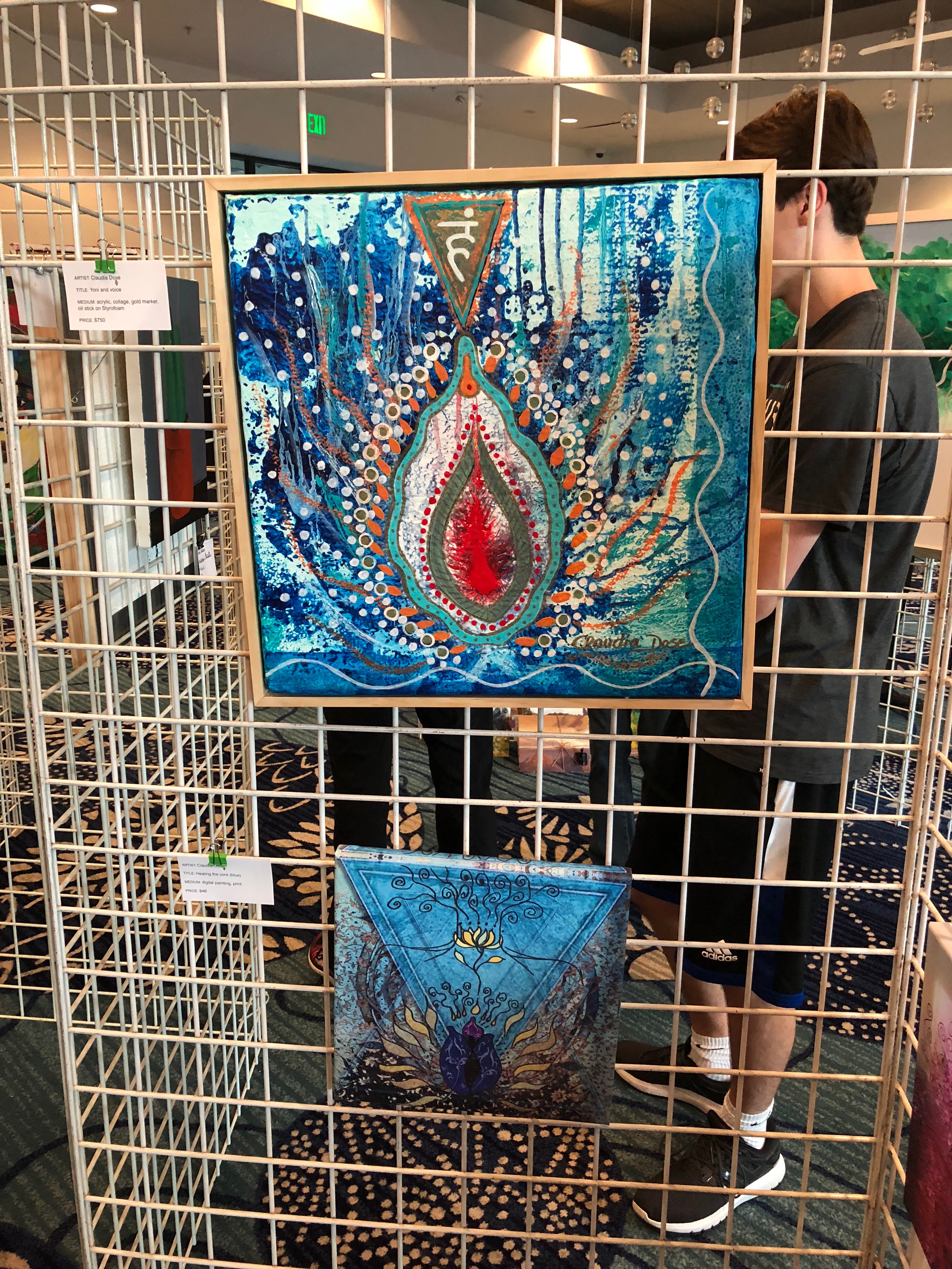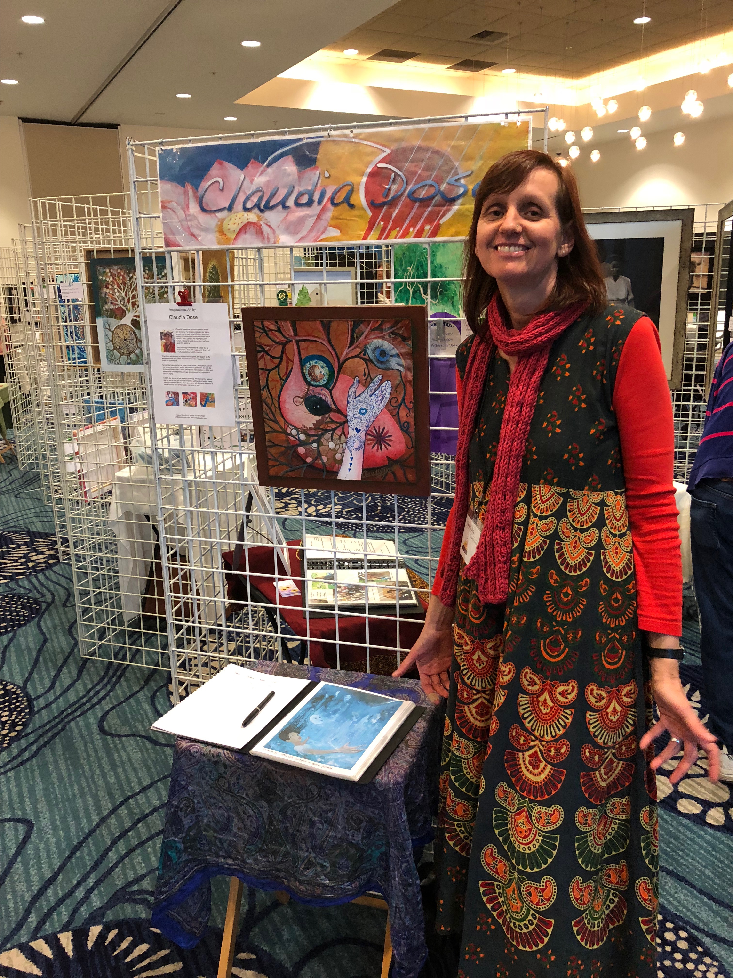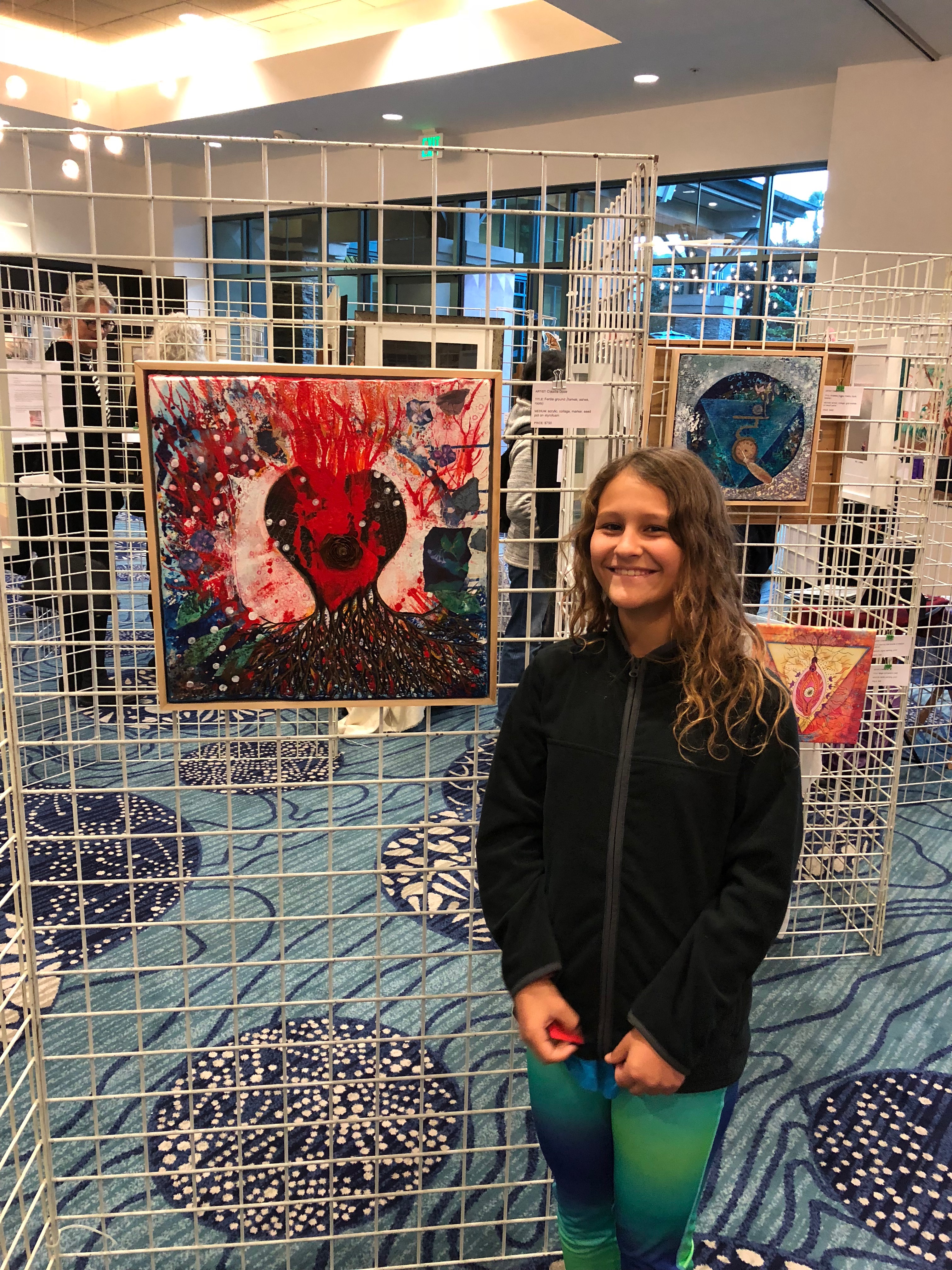 Claudia Dose with detail of “Heart Wisdom” painting at CCAG exhibit