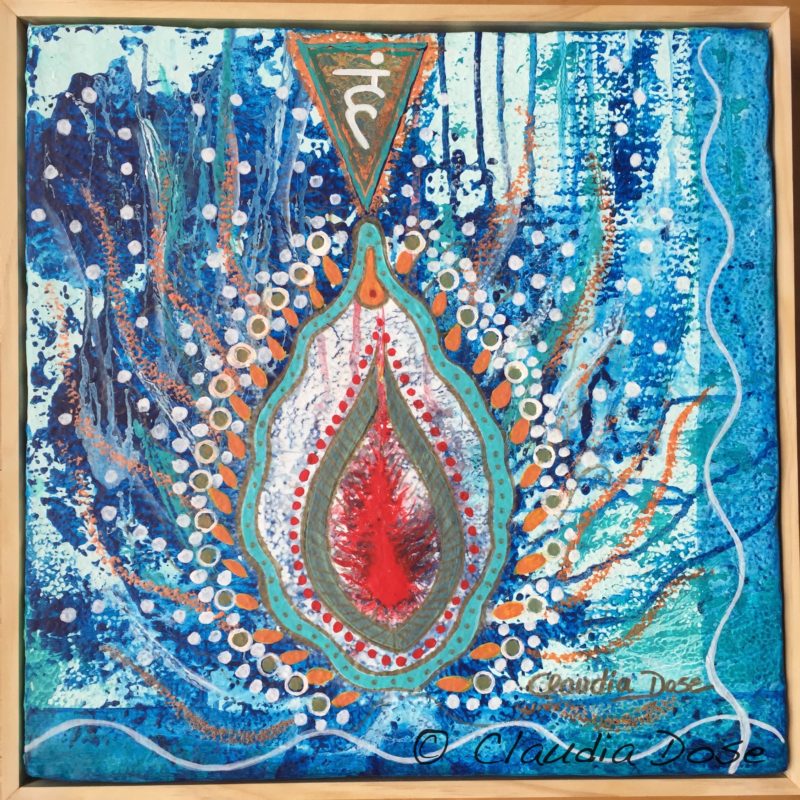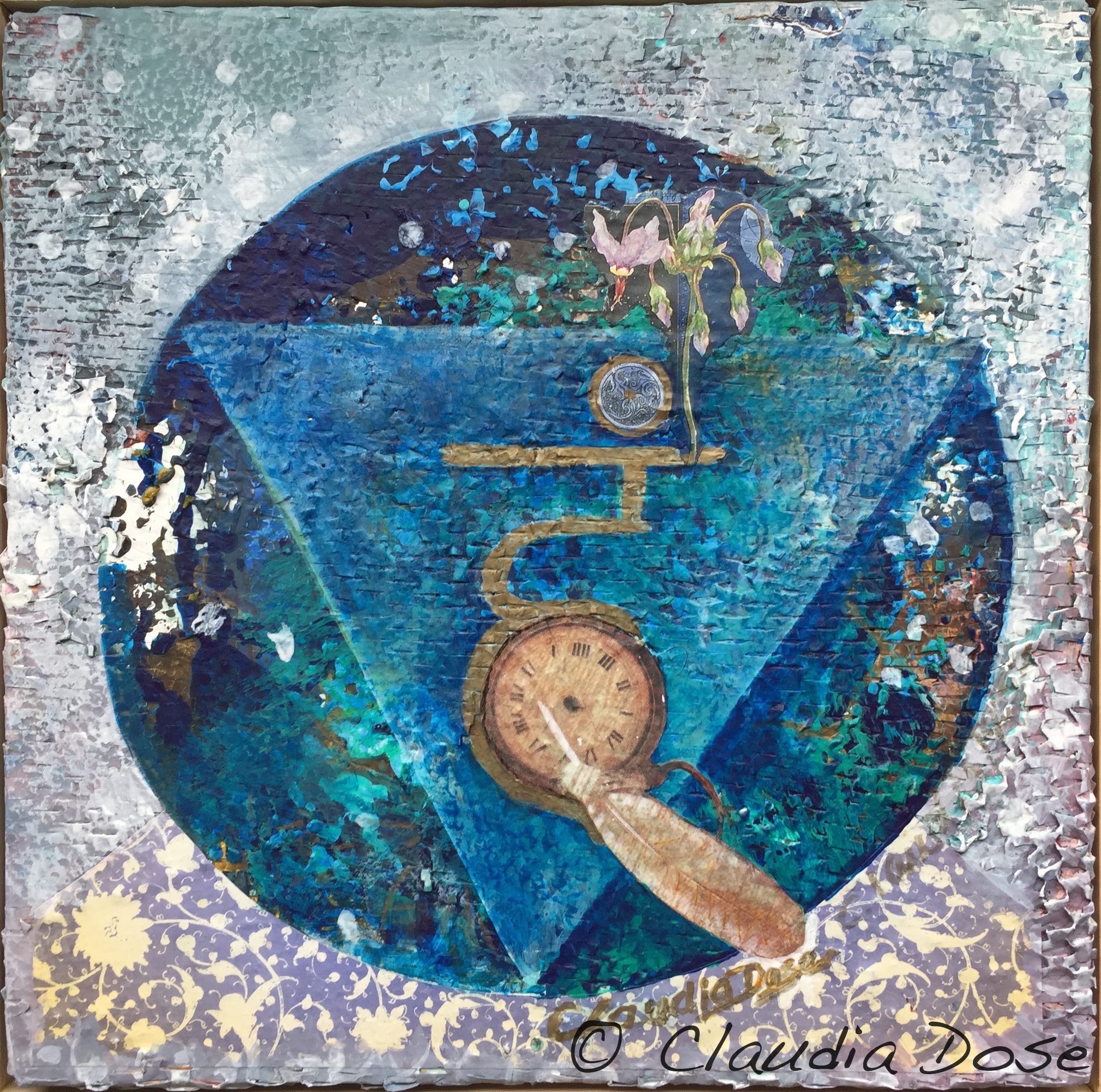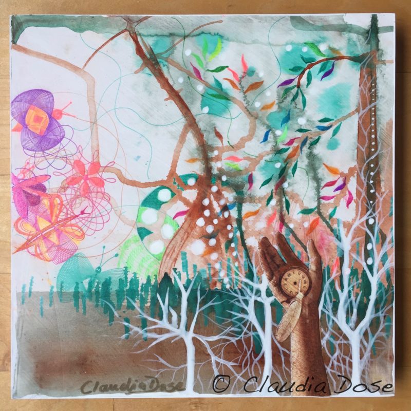 acrylic, collage, glitter gel pen, on wood panel, ready to hang,